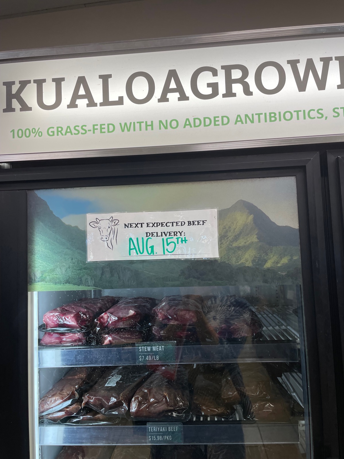 The Local General Store in Kaimuki is a butcher shop and bakery. They source whole-carcass beef (Makaha), pork (Waianae), lamb (Maui), and chicken (Waialua). Offerings include sausages, bacon, pates, soups, and marinated meats. The bakery uses local ingredients in croissants and Danishes. Open Thursday–Monday, 9 AM–5 PM, 3458 Waialae Ave. Contact: 808-777-2431. Sign up for their newsletter for weekly availability.