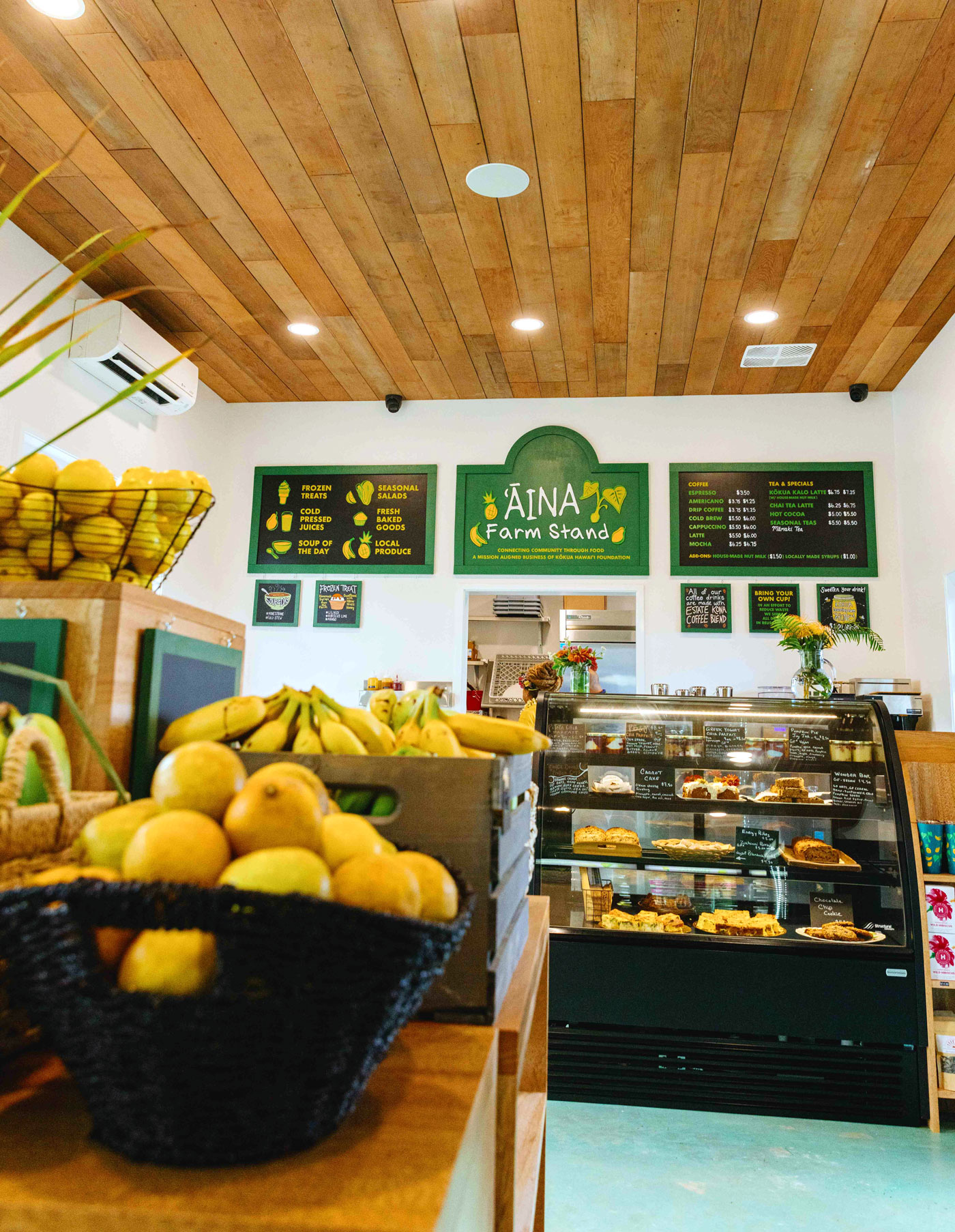 The ʻĀINA Farm Stand, which opened in November 2024, offers fresh fruits, vegetables, meats, seafood, and products from the Kōkua Learning Farm and other local farmers, as well as fresh coffee and café items. The ʻĀINA Farm Stand also carries seasonal flowers and lei to honor the historic building it occupies, the old Haleʻiwa Flower Shop. The farm stand is open weekdays, Weds. to Friday, 9 AM to 3 PM, and Saturday 8:30 AM to 2:30 PM.