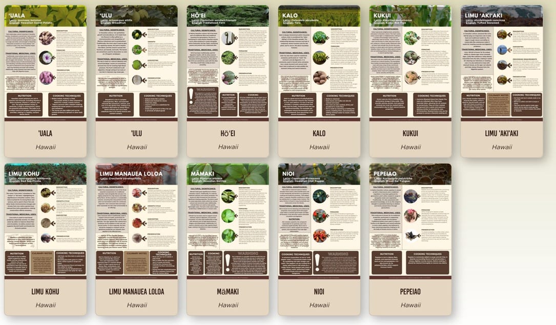 Lei Wann is also featured in four videos the Lab produced on foraging—for kukui, limu, and kalo. The foraging section for Hawaiʻi also presents 11 highly informative downloadable PDFs on the islands’ forageable plants: ʻulu, ʻuala, hoʻei (fiddlehead fern), kalo, kukui, three varieties of limu, mamaki, nioi (chili pepper), and pepeiao (wood ear fungus).